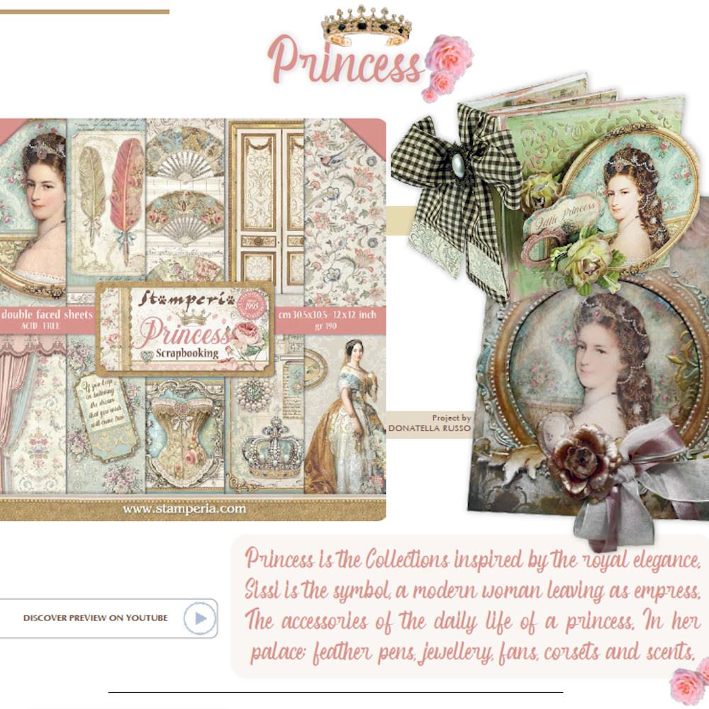 Princess è la Collezione di Stamperia ispirata all'eleganza regale. Sissi è un simbolo, una donna moderna che parte come imperatrice. In questa collezione ritroviamo gli accessori della vita quotidiana di una principessa, il palazzo, le penne, le piume, i gioielli, i ventagli, i corsetti e profumi.
